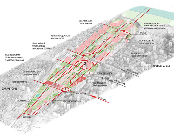 Mevcut işlevini sürdüren gar yapısının hızlı tren istasyonu ile entegre edilerek kuzeydeki yaya bağlantısının ana odağı olmasını önerdik. Araç odaklı planlama kararları, Seyhan Nehri'nin kıyı potansiyellerinin yeterince değerlendirilememesi, yeşil alan oranının azlığı, iklimsel verilere uygun olmayan yeni konut yapılaşması gibi problemlere öneriler getirirken, kentin tarımsal üretim altyapısı ve Cumhuriyet dönemi planlama kararlarını dikkate alan bir yaklaşım geliştirdik. Yaya ve bisiklet ulaşımına öncelik veren trafik düzenlemeleri ve buna uygun sokak kesitleri ile mekansal potansiyeli olan TCDD yapılarının yeniden kullanılarak farklı işlevler içeren, kent içinde önemli bir odak oluşturmasını amaçladık. Tüm bu kararlarla yarışma alanının Adana için bir simgeye; hem kentte yaşayanlar hem de dışarıdan gelenler için, hatırda kalan bir mekânlar dizisine dönüşeceğini hayal ediyoruz.